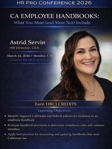 This session provides a practical overview of developing and maintaining compliant employee handbooks for California employers. Participants will learn required and recommended policies, common compliance risks, and best practices to ensure handbooks effectively communicate expectations while aligning with California and federal employment laws.