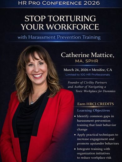 Catherine Mattice, MA, SPHR is the founder of Civility Partners, an OD firm that's assisted almost 300 clients globally in building better cultures. With 60+ LinkedIn Learning courses in 11 languages, 3M+ online learners, thousands of hours on stage in 15 countries, and features on CNN, NPR and others, she is the go-to expert on turning around toxic cultures and behavior. Her most recent book, Navigating a Toxic Workplace for Dummies (Wiley's brand), is available with all major book retailers.