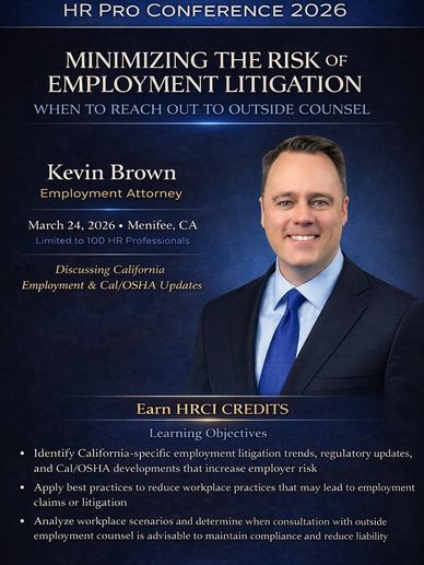 In this informative presentation, management-side employment attorney Kevin Brown will discuss single plaintiff and class action litigation trends, legislative and caselaw updates, as well as best practices to minimize the risk of litigation for employers. Attendees will come away with legal updates in California employment law we well as Cal/OSHA. Kevin will also provide practical tips for minimizing litigation risk that attendees can take back to their companies, as well as a checklist for when to consider reaching out to employment counsel based on real world examples.