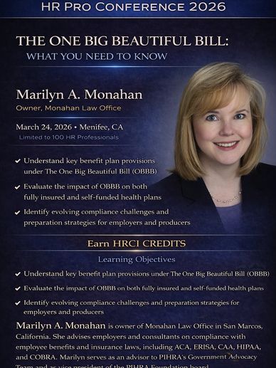 Marilyn A. Monahan is owner of Monahan Law Office in San Marcos, California. She advises employers and consultants on compliance with employee benefits and insurance laws, including ACA, ERISA, CAA, HIPAA, and COBRA. Marilyn serves as an advisor to PIHRA’s Government Advocacy Team and as vice president of the PIHRA Foundation board.